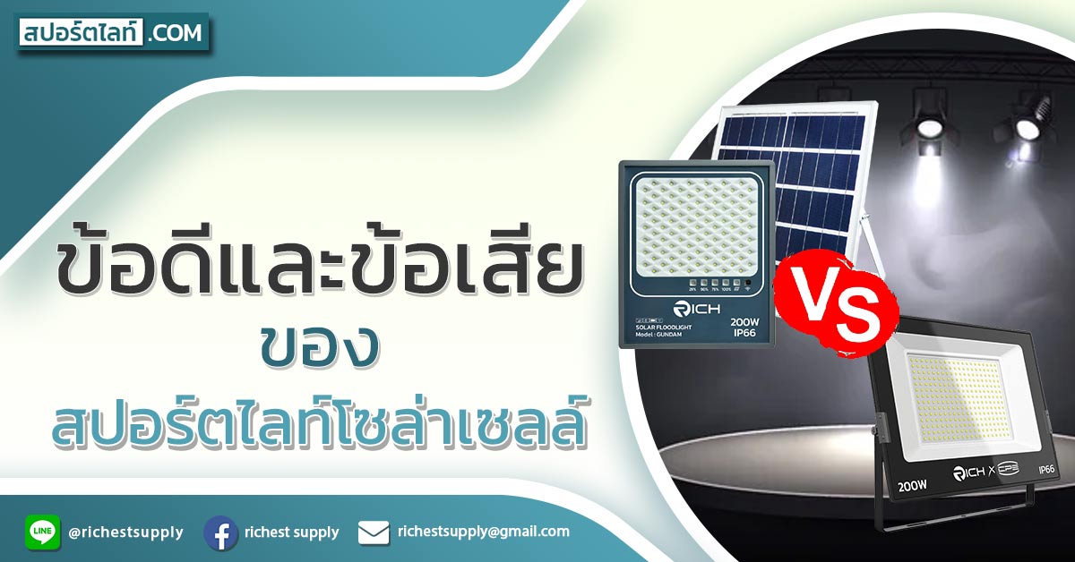 สปอร์ตไลท์โซล่าเซลล์ มีข้อดีหลายประการที่เหนือกว่า ไฟสปอร์ตไลท์ LED แบบเก่า เช่น ประสิทธิภาพการใช้พลังงาน ความเป็นมิตรต่อสิ่งแวดล้อม ติดตั้งง่าย การบำรุงรักษาต่ำ และความคุ้มค่า อย่างไรก็ตาม พวกมันก็มีข้อเสียเช่นกัน เช่น ระยะเวลาการส่องสว่างที่จำกัด ซึ่งขึ้นอยู่กับสภาพอากาศ อายุการใช้งานแบตเตอรี่ที่จำกัด และราคาที่เริ่มต้นที่สูงกว่าแบบใช้ไฟปกติ ท้ายที่สุด ทางเลือกระหว่าง สปอร์ตไลท์โซล่าเซลล์ และ สปอร์ตไลท์ LED จะขึ้นอยู่กับความต้องการ และความเหมาะสมของพื้นที่นั่นเอง ทั้งนี้พวกเราเองก็มีจำหน่ายทั้ง 2 แบบ เช่น สปอร์ตไลท์โซล่าเซลล์ RICH Gundam และ สปอร์ตไลท์ LED RICH COOLER ซึ่งทั้ง 2 รุ่นต่างก็เป็นรุ่นยอดนิยมของผู้ใช้งานที่เข้ามาเลือกซื้อกับเรานั่นเอง