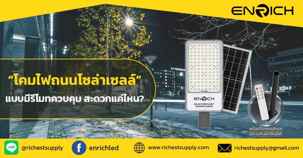 โคมไฟถนนโซล่าเซลล์แบบมีรีโมทควบคุม สะดวกแค่ไหน? ในยุคที่เทคโนโลยีกำลังก้าวหน้าอย่างรวดเร็ว การใช้พลังงานสะอาดอย่างพลังงานแสงอาทิตย์กลายเป็นทางเลือกที่ได้รับความนิยมมากขึ้นเรื่อยๆ โดยเฉพาะในแวดวงการให้แสงสว่างอย่างโคมไฟถนนโซล่าเซลล์ ซึ่งในปัจจุบันได้มีการพัฒนารูปแบบและฟังก์ชันการใช้งานให้ทันสมัยมากขึ้น โดยหนึ่งในนวัตกรรมที่น่าสนใจคือ โคมไฟถนนโซล่าเซลล์ แบบมีรีโมทควบคุม ที่มาพร้อมกับความสะดวกสบายและประสิทธิภาพสูง 1. โคมไฟถนนโซล่าเซลล์แบบมีรีโมทควบคุมคืออะไร? โคมไฟถนนโซล่าเซลล์แบบมีรีโมทควบคุมคือโคมไฟที่ใช้พลังงานจากแสงอาทิตย์ โดยมีระบบควบคุมการทำงานผ่านรีโมทคอนโทรล ซึ่งช่วยให้ผู้ใช้งานสามารถปรับแต่งการทำงานของโคมไฟได้อย่างง่ายดาย ไม่ว่าจะเป็นการเปิด-ปิดไฟ, ตั้งเวลาการทำงาน, ปรับความสว่างของแสงไฟ และตรวจสอบสถานะการทำงานของโคมไฟได้จากระยะไกล 2. ความสะดวกสบายของโคมไฟถนนโซล่าเซลล์แบบมีรีโมทควบคุม 2.1 การควบคุมการทำงานได้จากระยะไกล หนึ่งในจุดเด่นที่ทำให้โคมไฟถนนโซล่าเซลล์แบบมีรีโมทควบคุมได้รับความนิยมคือความสามารถในการควบคุมการทำงานได้จากระยะไกล โดยไม่จำเป็นต้องเดินทางไปยังจุดที่ติดตั้งโคมไฟ เพียงแค่ใช้รีโมทคอนโทรลหรือแอปพลิเคชันบนสมาร์ทโฟนก็สามารถสั่งการทำงานได้ทันที เปิด-ปิดไฟได้ตามต้องการ: ไม่ต้องเสียเวลาเดินไปเปิดหรือปิดไฟด้วยตัวเอง ตั้งเวลาเปิด-ปิดอัตโนมัติ: สามารถตั้งเวลาให้โคมไฟทำงานตามเวลาที่กำหนดได้ เช่น เปิดไฟตอนพระอาทิตย์ตกและปิดไฟตอนพระอาทิตย์ขึ้น ปรับความสว่างของแสงไฟ: สามารถปรับระดับความสว่างของแสงไฟได้ตามความต้องการ ช่วยประหยัดพลังงานและยืดอายุการใช้งานของแบตเตอรี่ 2.2 ไม่ต้องเดินสายไฟให้ยุ่งยาก โคมไฟถนนโซล่าเซลล์แบบมีรีโมทควบคุมใช้พลังงานจากแสงอาทิตย์ จึงไม่จำเป็นต้องเดินสายไฟให้ยุ่งยาก ช่วยลดต้นทุนในการติดตั้งและบำรุงรักษา นอกจากนี้ยังเหมาะสำหรับพื้นที่ห่างไกลหรือพื้นที่ที่ไฟฟ้าเข้าไม่ถึง 2.3 ระบบอัตโนมัติที่ชาญฉลาด โคมไฟถนนโซล่าเซลล์แบบมีรีโมทควบคุมมักมาพร้อมกับระบบอัตโนมัติที่ชาญฉลาด เช่น ระบบตรวจจับการเคลื่อนไหว (Motion Sensor) ที่จะเปิดไฟอัตโนมัติเมื่อมีคนหรือรถผ่านเข้ามาในบริเวณนั้น ช่วยเพิ่มความปลอดภัยและประหยัดพลังงาน 3. ประโยชน์ของโคมไฟถนนโซล่าเซลล์แบบมีรีโมทควบคุม 3.1 ประหยัดพลังงานและลดค่าใช้จ่าย การใช้พลังงานแสงอาทิตย์ช่วยลดการพึ่งพาพลังงานไฟฟ้าจากระบบกริด ซึ่งช่วยประหยัดค่าไฟฟ้าได้อย่างมาก นอกจากนี้ยังช่วยลด